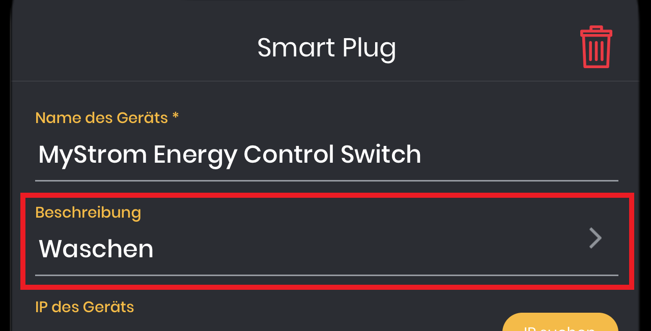 Beschreibung der GeräteBei jedem Gerät ist es optional möglich, eine Beschreibung hinzuzufügen. Dies dient insbesondere dazu, Geräte des gleichen Typs (z. B. Smart Plugs) unterscheiden zu können. Wird derselbe Name mehrmals zugewiesen, werden die Geräte gruppiert. Dadurch kann zum Beispiel eine Energiemessung mit einer Wärmepumpe verknüpft werden, um den Energieverbrauch der Wärmepumpe zu verfolgen.