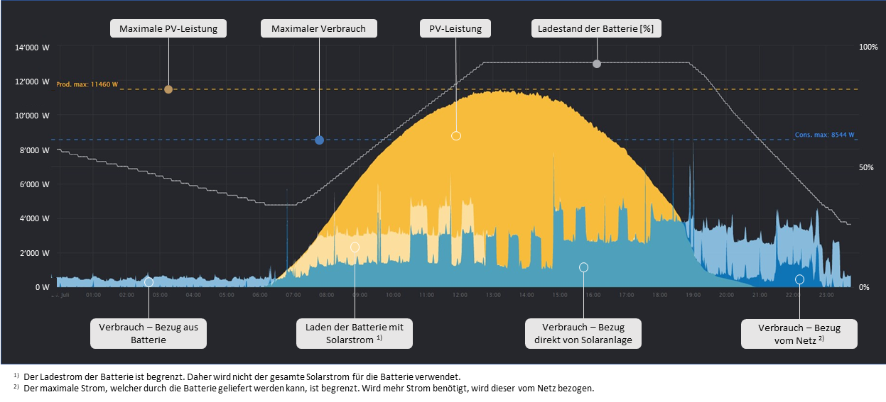 Der Solar Manager unterstützt neu die Integration von Batterien. Damit sichtbar ist, wann die Batterie ge- und entladen wird, haben wir unser Dashboard erweitert. Diese Erweiterung ist unter dem folgenden Link beschrieben.