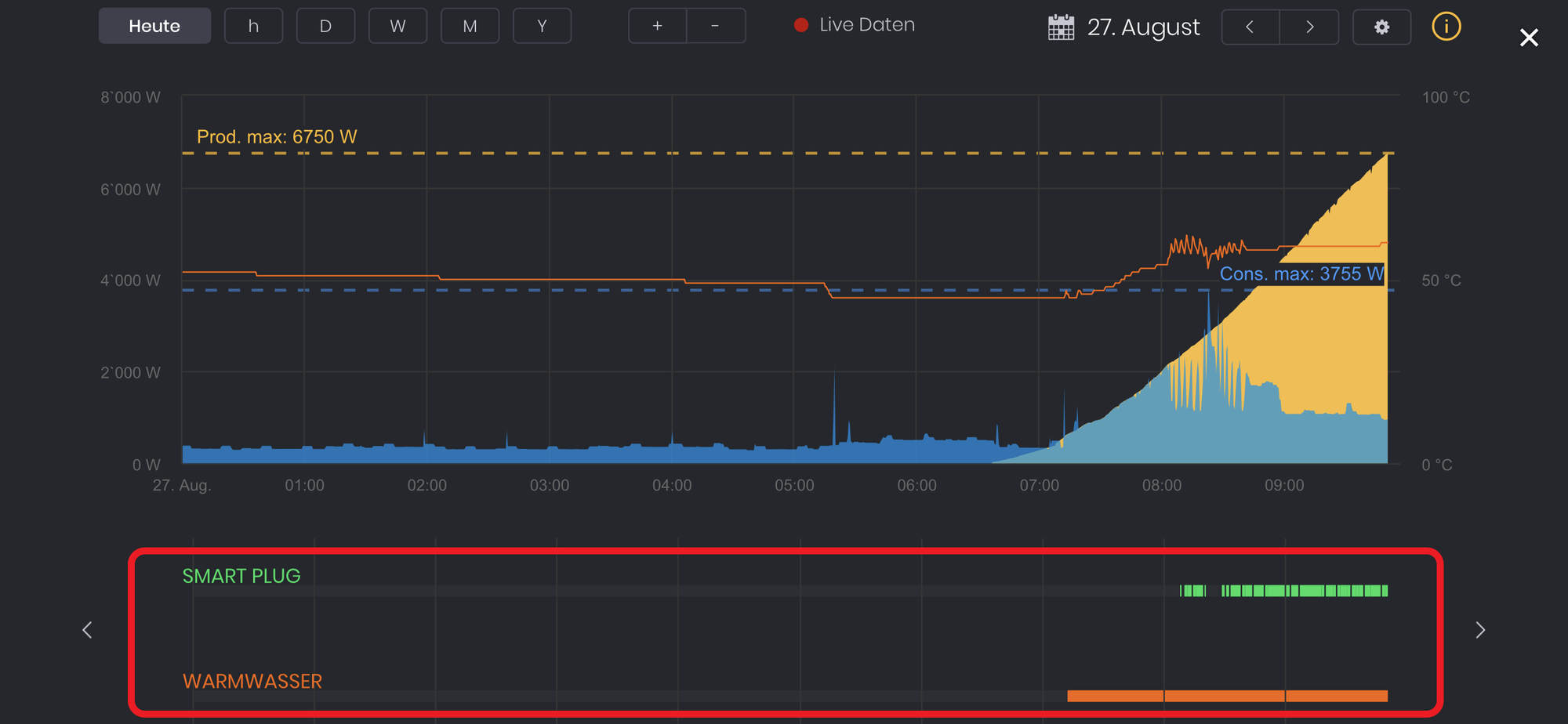 Unterhalb des Dashboards gibt es neu eine Ansicht, in welcher sichtbar ist, welcher Verbraucher zu welchem Zeitpunkt Strom bezogen hat (siehe rote Markierung). Damit ist sichtbar, ob der Solar Manager nach den Kunden-Bedürfnissen arbeitet oder ob die Einstellungen des Solar Managers allenfalls noch angepasst werden müssen.