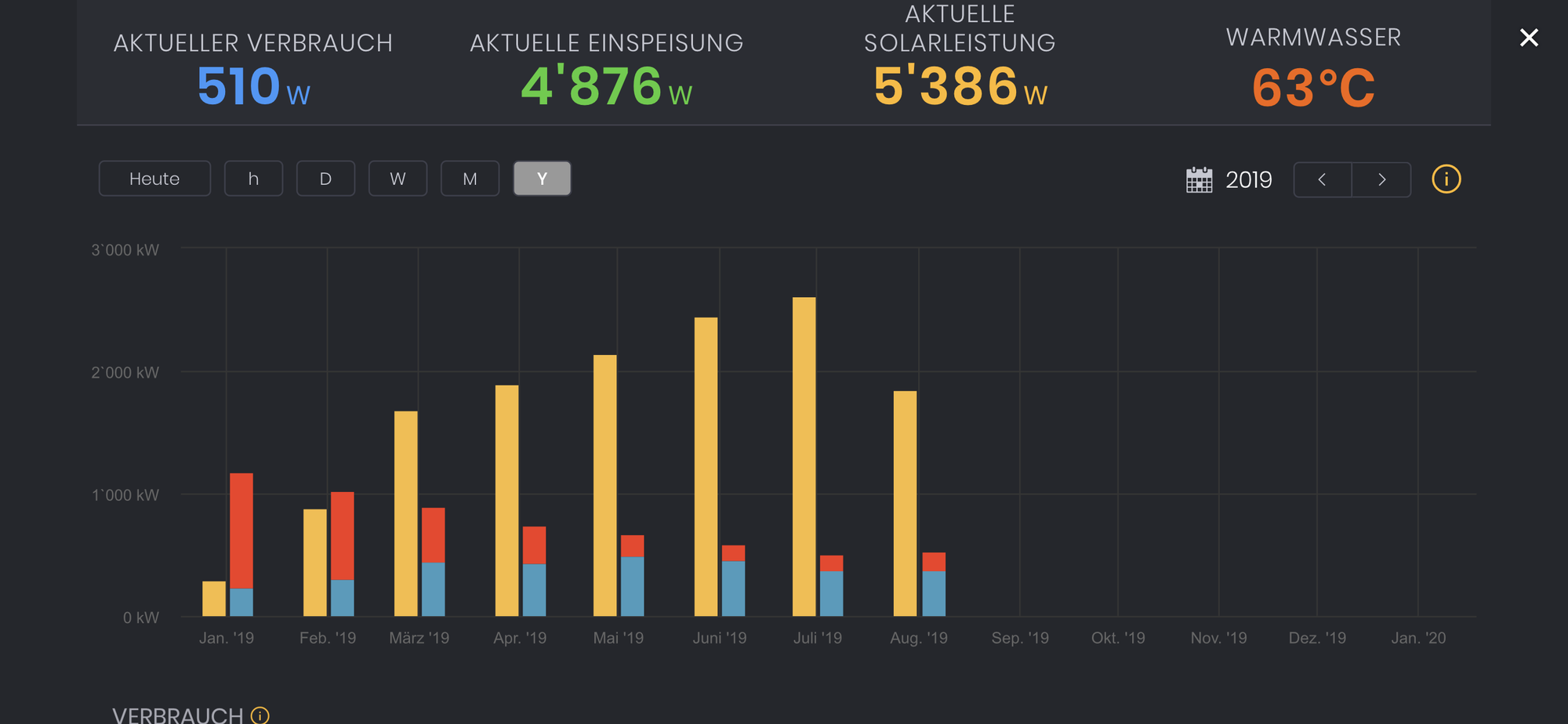 Die Monats- und Jahresansicht im Dashboard wurde verbessert. In diesen Ansichten werden die Solarenergie, der Verbrauch und der Netzbezug neu als Säulendiagramme dargestellt. Die Monats- und Jahresansicht kann mittels Klick auf "M" bzw. "Y" links oberhalb des Dashboards erreicht werden.