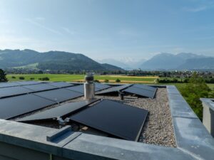 Auch die Umsetzung stellte das Projektteam vor besondere Herausforderungen. Die Hanglage der Überbauung und die eingeschränkte Zufahrt schlossen den Einsatz eines Krans aus. Deshalb wurde das Material per Helikopter auf die Dächer gebracht. Solarmodule, Unterkonstruktion und weiteres Material konnten so präzise, sicher und effizient eingebracht werden. Während der Realisierung zeigte sich zudem zusätzlicher Sanierungsbedarf an Teilen der Dachisolation. Diese unvorhergesehene Aufgabe musste zusammen mit Dachdecker und Gerüstbauer koordiniert werden. Zum Einsatz kam dabei eine EPDM-Abdichtung. Trotz dieser Zusatzarbeiten wurde das Projekt innerhalb weniger Wochen erfolgreich umgesetzt.