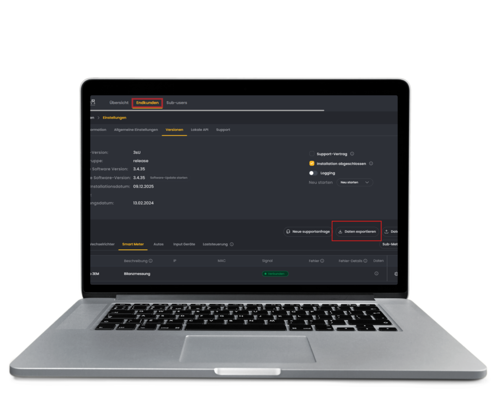 Mit dem Solar Manager lassen sich Anlagendaten schnell und unkompliziert exportieren. Der Datenexport wird direkt über das Portal ausgelöst und automatisch an die hinterlegte E-Mail-Adresse gesendet.